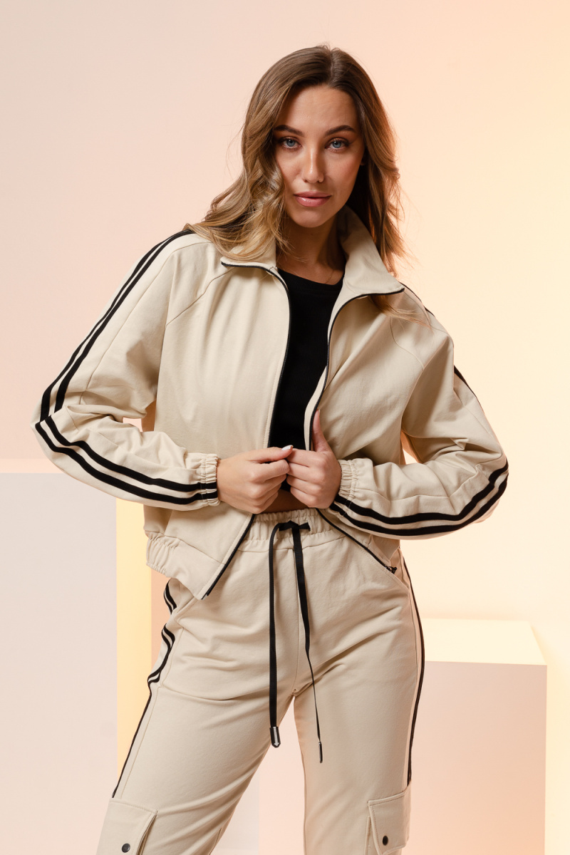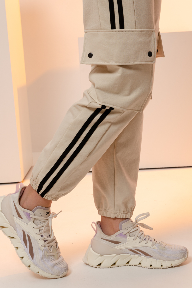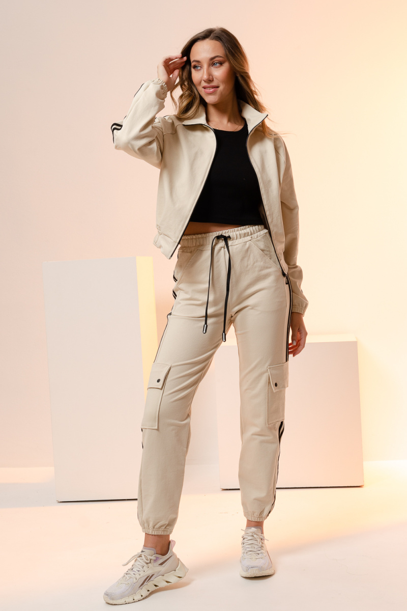 Крой ветровки укороченный, с воротником-стойка, по рукавам контрастные полоски. Брюки в стиле карго с полосками по бокам, высокой посадкой имеют прямой крой, брюки будут держать модную планку еще несколько сезонов. За счет своего удобства и комфорта этот фасон стремительно набирает популярность. Легкий комплект произведен с учетом большинства особенностей фигур. Исходя из этого, отлично подойдет как для худеньких девушек и подростков, так и для полных, как для высоких, так и для среднего роста женщин.